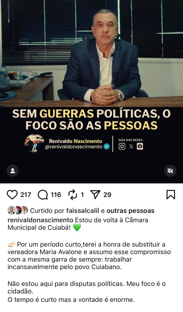 Em suas redes sociais, Renivaldo anunciou o retorno e destacou que será por um período curto, mas com muito empenho. “Por um período curto, terei a honra de substituir a vereadora Maria Avalone e assumo esse compromisso com a mesma garra de sempre: trabalhar incansavelmente pelo povo cuiabano”, escreveu.