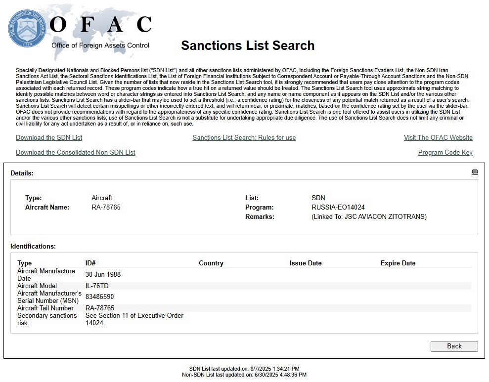 Essa companhia aérea foi sancionada pelo governo dos Estados Unidos em 2023, por usar suas aeronaves para transportar cargas para a Venezuela. O próprio avião RA-78765 consta na lista de sanções da Agência de Controle de Ativos Estrangeiros dos EUA (OFAC).