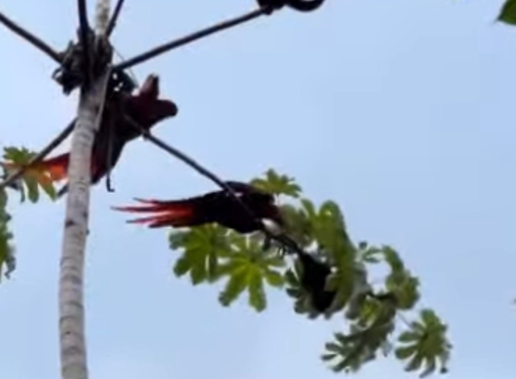 Um episódio surpreendente foi registrado na Costa Rica, onde um casal de araras-vermelhas (Ara macao cyanoptera) protagonizou um verdadeiro embate aéreo contra um grupo de macacos bugios (Alouatta spp.) que tentavam se aproximar do ninho das aves. A cena ocorreu no alto de uma árvore, mostrando a determinação das aves em defender seus filhotes.