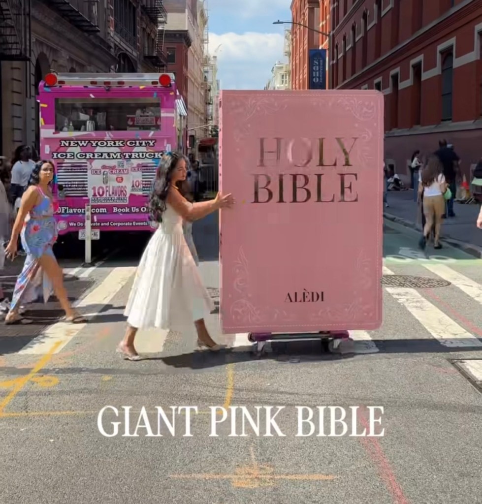 Durante a Fashion Week de Nova York, um dos maiores eventos de moda do mundo, a estilista evangélica Maria Alejandra Diaz surpreendeu ao desfilar pelas ruas com uma Bíblia gigante e rosa, que trazia a frase “Jesus loves you” (“Jesus ama você”). A iniciativa chamou a atenção de quem passava e abriu espaço para reflexão em meio ao glamour da moda.