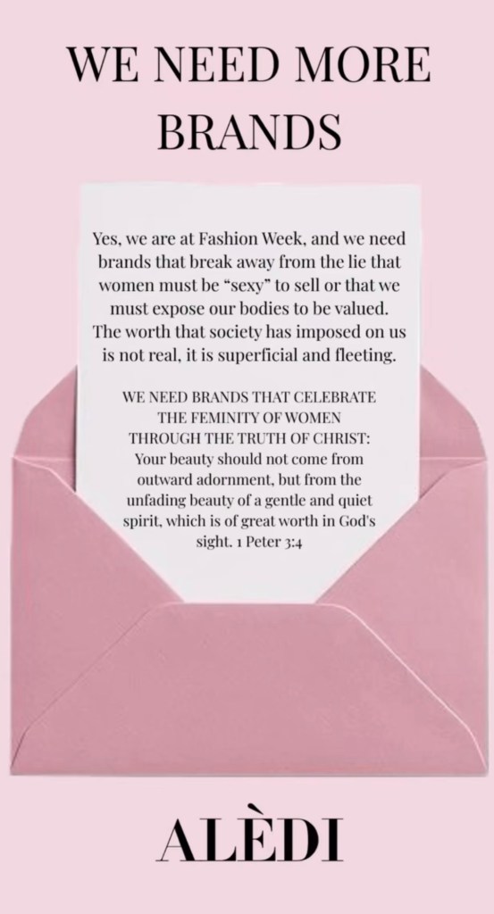 Criadora da marca “Alède”, voltada para a chamada moda modesta, Alejandra afirma que seu objetivo é usar a arte e o design como ferramentas de evangelização. Para ela, a verdadeira valorização da mulher está no respeito e na dignidade, não na erotização tão comum na indústria fashion.