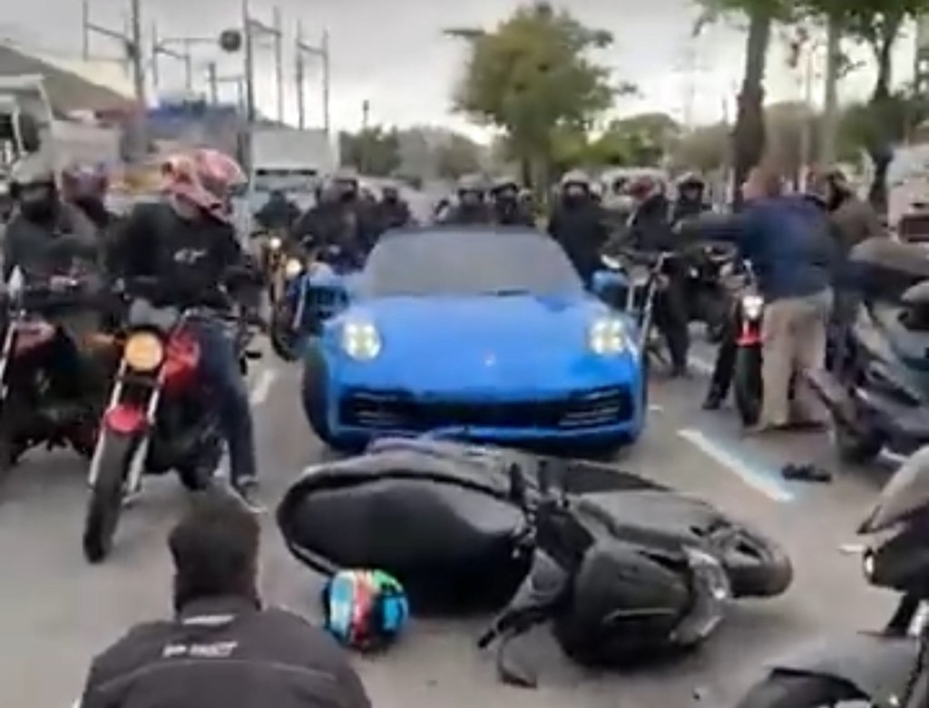 Testemunhas registraram o momento em que cerca de 20 motociclistas cercaram o Porsche para impedir uma possível fuga do influenciador e auxiliar a vítima. Em seguida, Bernardino foi algemado por policiais que atenderam à ocorrência.