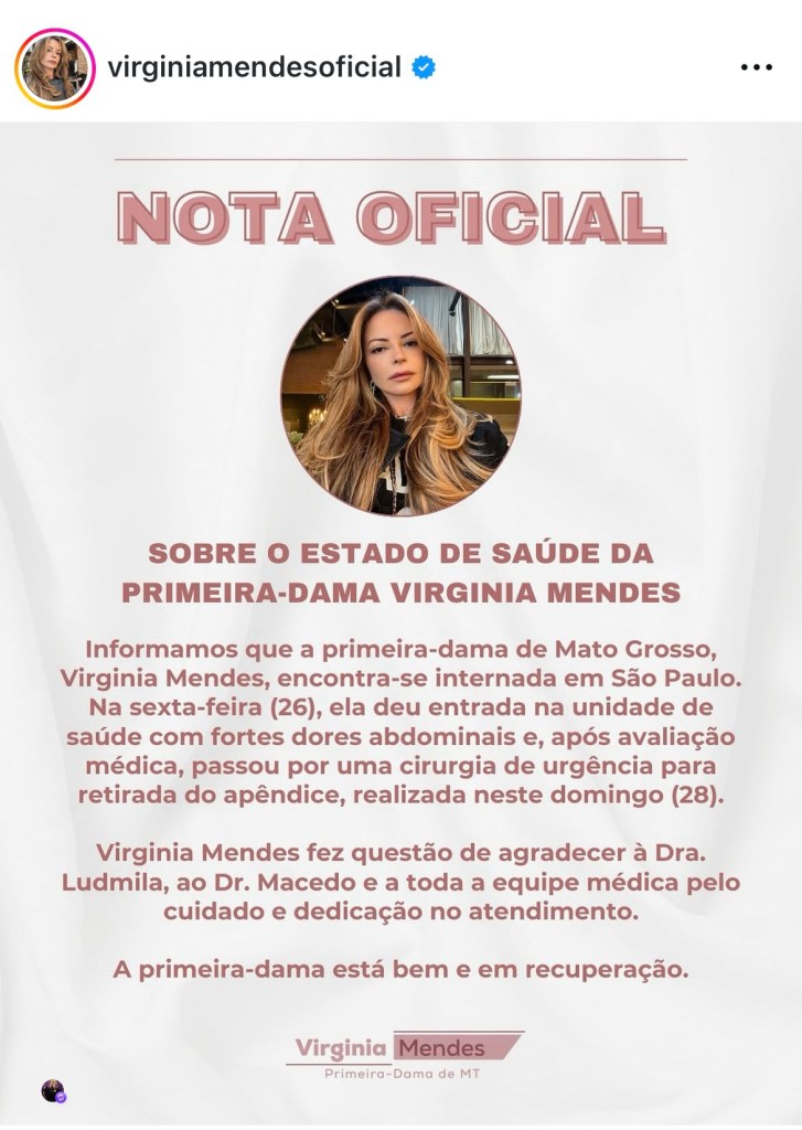 A primeira-dama de Mato Grosso, Virginia Mendes, encontra-se internada em São Paulo após ser submetida a uma cirurgia de urgência para retirada do apêndice. Ela deu entrada na unidade de saúde na sexta-feira (26) com fortes dores abdominais e, após avaliação médica, o procedimento foi realizado no domingo (28).