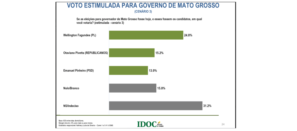 No terceiro cenário, sem Emanuel Pinheiro e com a inclusão da médica Natasha Slhessarenko (PSD), Wellington permanece em primeiro lugar, com 21,7%. Jayme Campos vem em seguida, com 17,2%, e Otaviano Pivetta aparece com 13,3%. Natasha, ainda pouco conhecida entre os eleitores da Capital, registra 6,7% das intenções de voto.