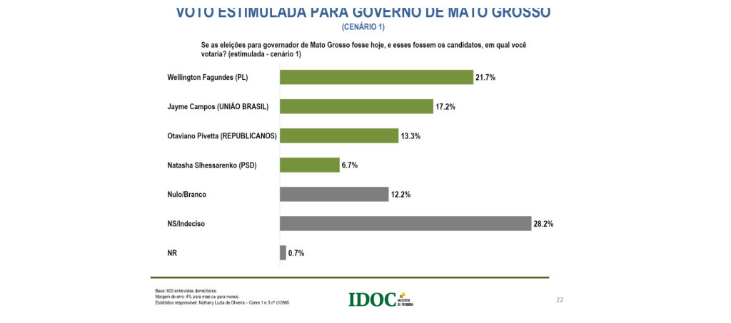 No primeiro cenário, Wellington lidera com 22,4% das intenções de voto. O senador Jayme Campos (União Brasil) aparece logo atrás, com 18,5%, configurando empate técnico dentro da margem de erro. O vice-governador Otaviano Pivetta (Republicanos) tem 14,3%, seguido do ex-prefeito Emanuel Pinheiro (PSD), que soma 12,7%.