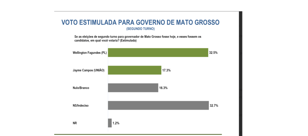 Os cenários de segundo turno confirmam a vantagem de Wellington. Contra Jayme Campos, ele teria 32,5%, enquanto o adversário ficaria com 17,3%. Em uma disputa com Otaviano Pivetta, os números se repetem: 32,5% para Wellington e 16,5% para o vice-governador.