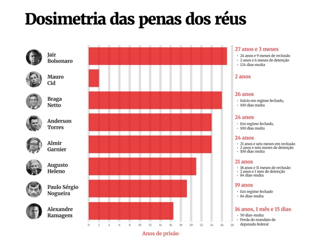 O ex-presidente Bolsonaro recebeu a pena mais alta entre os réus: 27 anos e 3 meses de prisão, sendo 24 anos e 9 meses em regime fechado e 2 anos e 6 meses em regime semiaberto. Além dele, foram condenados: