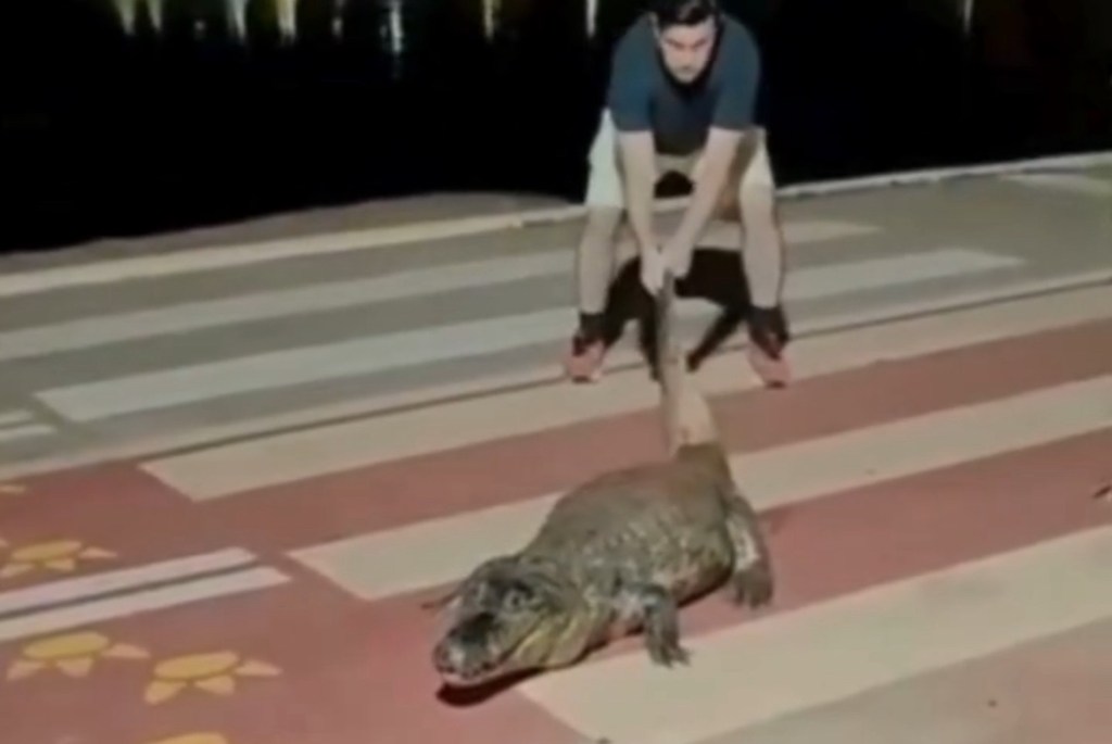 No Parque das Águas, em Cuiabá, imagens registram visitantes tentando retirar o jacaré conhecido como “Celso” da faixa de pedestres puxando-o pelo rabo. Apesar do cercamento e do contato, o animal não atacou e ninguém ficou ferido.