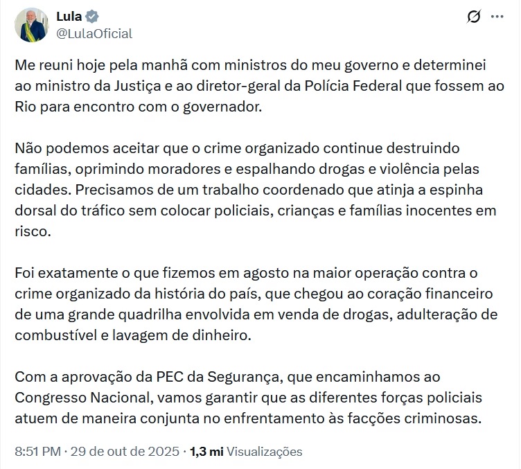 O presidente Luiz Inácio Lula da Silva (PT) divulgou nesta quarta-feira (29) sua primeira nota oficial sobre a megaoperação policial realizada no Rio de Janeiro, que resultou em 121 mortos, incluindo quatro policiais. Apesar da gravidade do episódio, o presidente não se solidarizou nem mencionou os agentes que perderam a vida, concentrando seu posicionamento apenas na defesa do Estado e no combate ao crime organizado.
