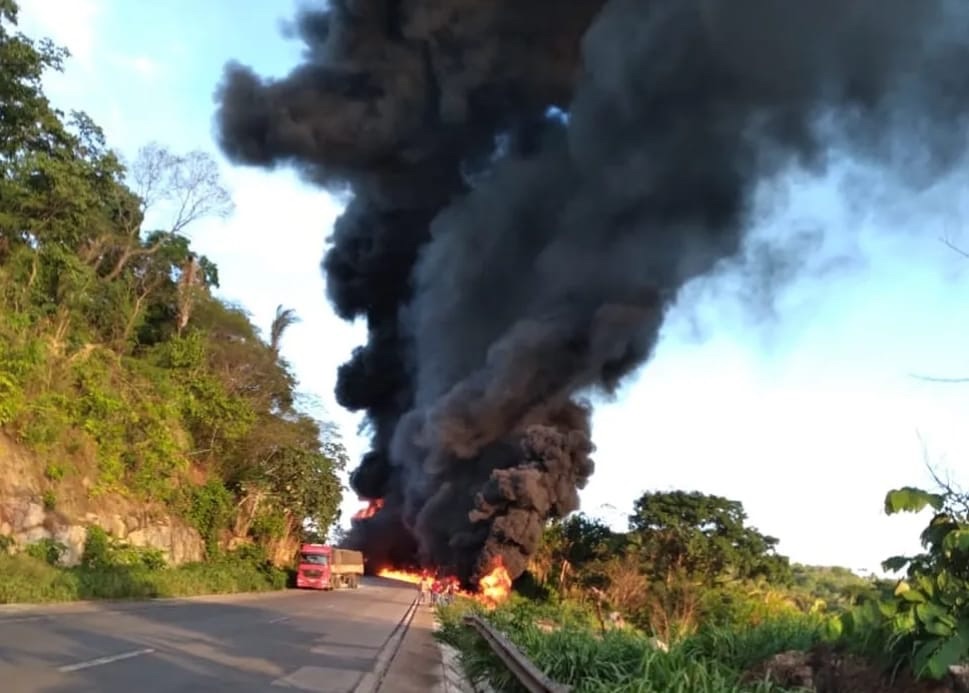 Uma carreta tombou no início da tarde desta quinta-feira (27) no km 347 da BR-364, na região da Serra de São Vicente, em Santo Antônio de Leverger, a cerca de 35 km de Cuiabá. O acidente provocou incêndio no veículo e deixou o trânsito completamente interditado no sentido sul da rodovia.