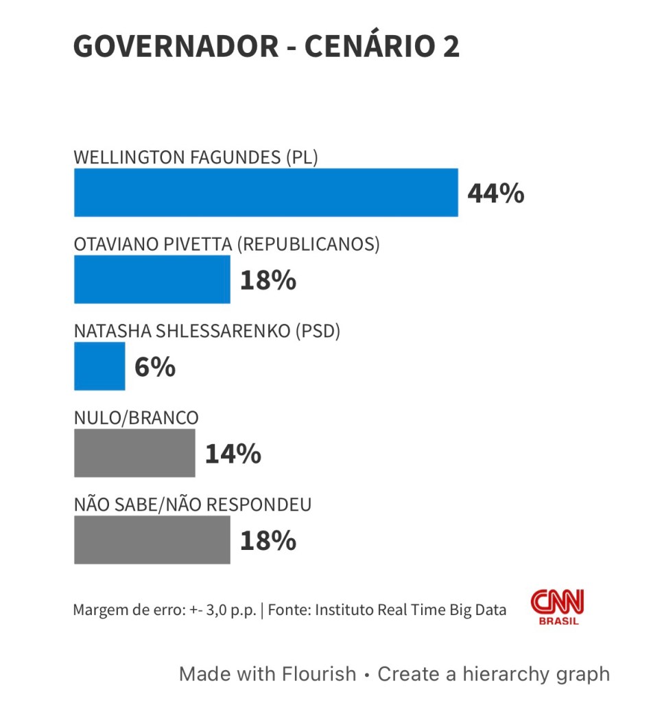 Em um segundo cenário da pesquisa, o senador chega a 44%, contra 18% de Pivetta; a médica Natasha Shlessarenko (PSD) aparece com 6%.