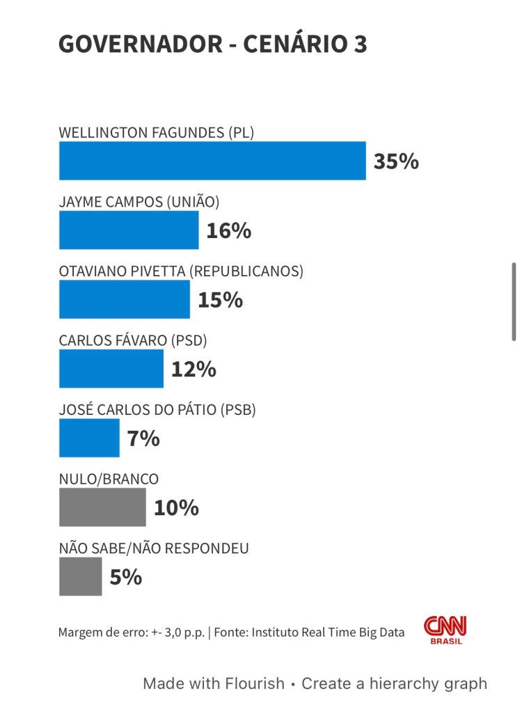 Num terceiro cenário, Fagundes mantém a liderança com 35%, seguido por Jayme Campos (União Brasil), com 16%, Pivetta com 15%, o ministro da Agricultura, Carlos Fávaro (PSD), com 12%, e José Carlos do Pátio com 7%.