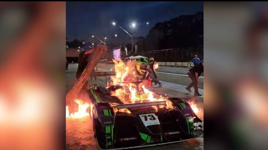 Imagens registraram o momento em que as chamas envolveram o veículo. Totti tentou sair rapidamente do cockpit e a equipe correu para controlar o incêndio usando diversos extintores.
