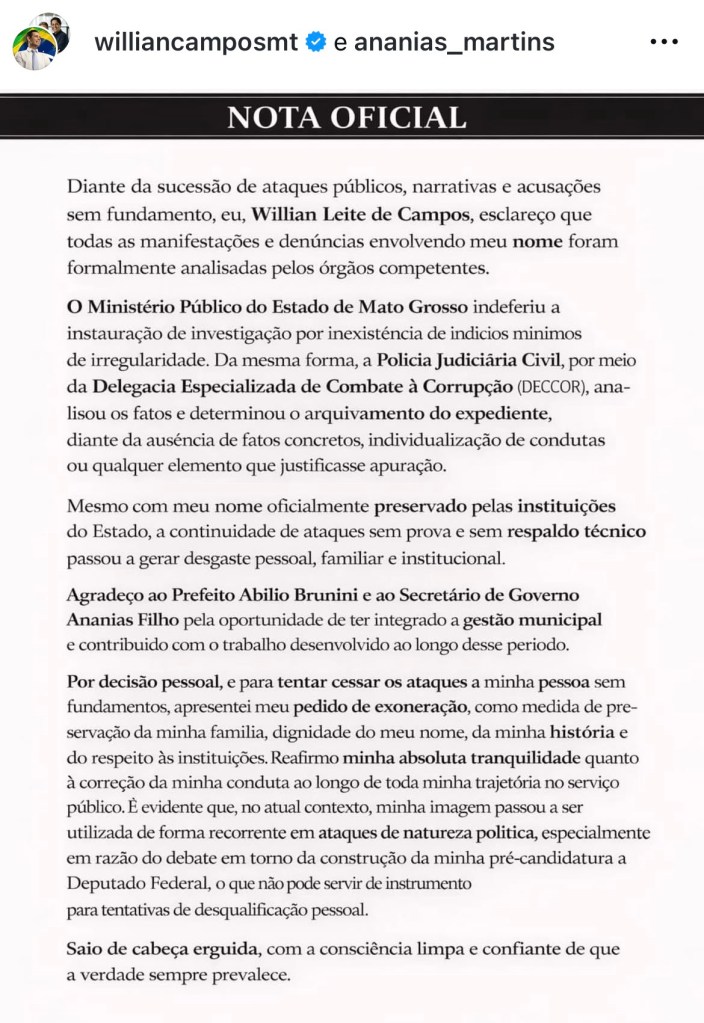 O desligamento foi comunicado oficialmente à Secretaria Municipal de Governo. Na mensagem, William agradeceu ao prefeito Abilio Brunini e aos servidores pelo período em que esteve à frente das políticas de geração de emprego na capital.